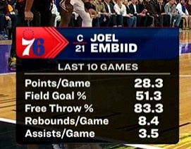 乐竞体育APP下载-过去10场比赛:恩比德场均28.3分8.4板3.5助 投篮51.3%&罚球83.3%